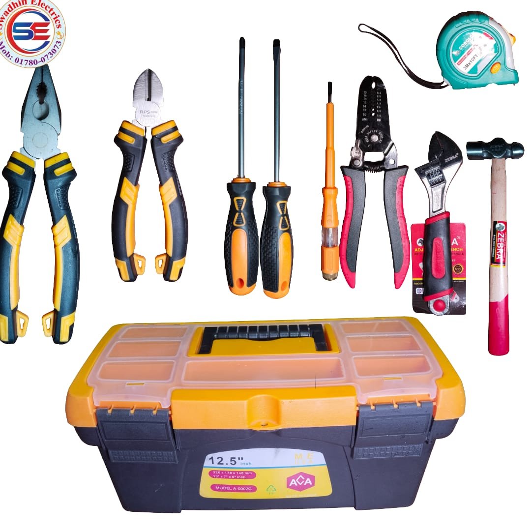 মজবুত প্লাস্টিক টুল বক্সে সব টুল সুন্দরভাবে রাখা যায়, যা বহন ও সংরক্ষণ সহজ করে। দৈনন্দিন ইলেকট্রিক কাজ, মেরামত এবং DIY প্রজেক্টের জন্য এটি একটি নির্ভরযোগ্য সমাধান।